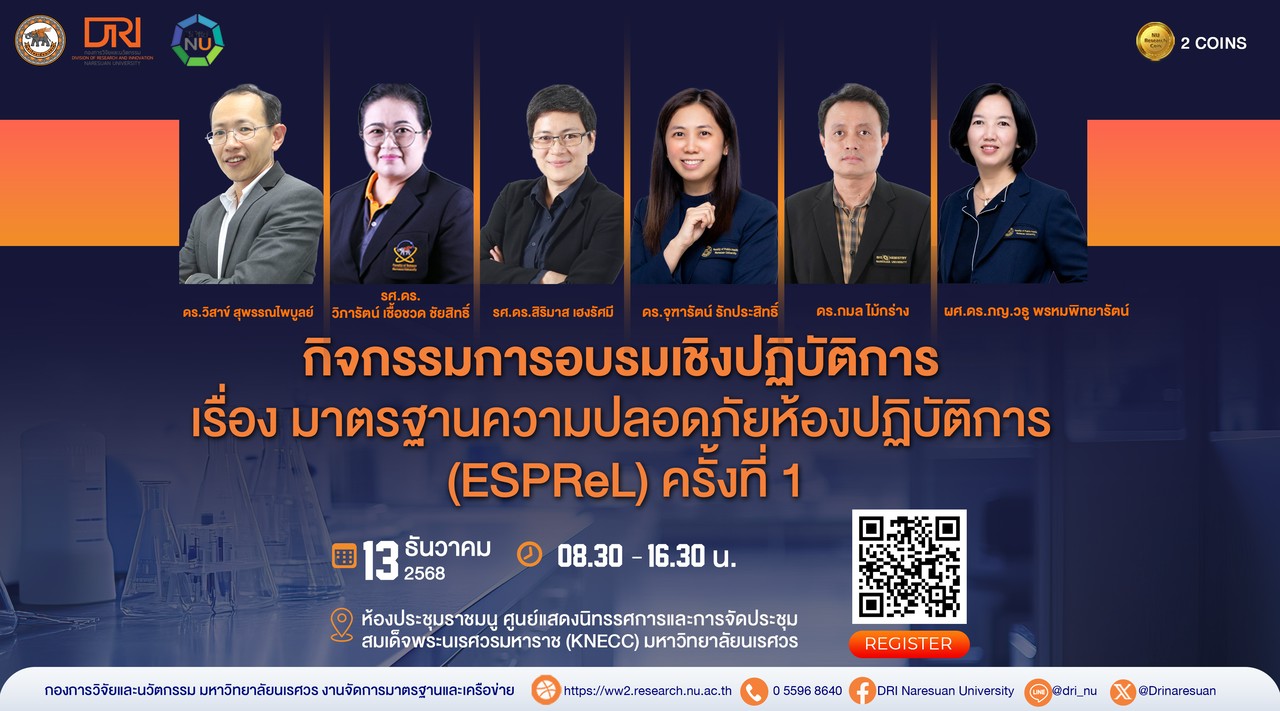 กองการวิจัยและนวัตกรรม มหาวิทยาลัยนเรศวร ขอเชิญนักวิจัย คณาจารย์ บุคลากร และผู้สนใจ เข้าร่วมกิจกรรมอบรมเชิงปฏิบัติการ เรื่อง “มาตรฐานความปลอดภัยห้องปฏิบัติการ (ESPReL)” (7 องค์ประกอบ)