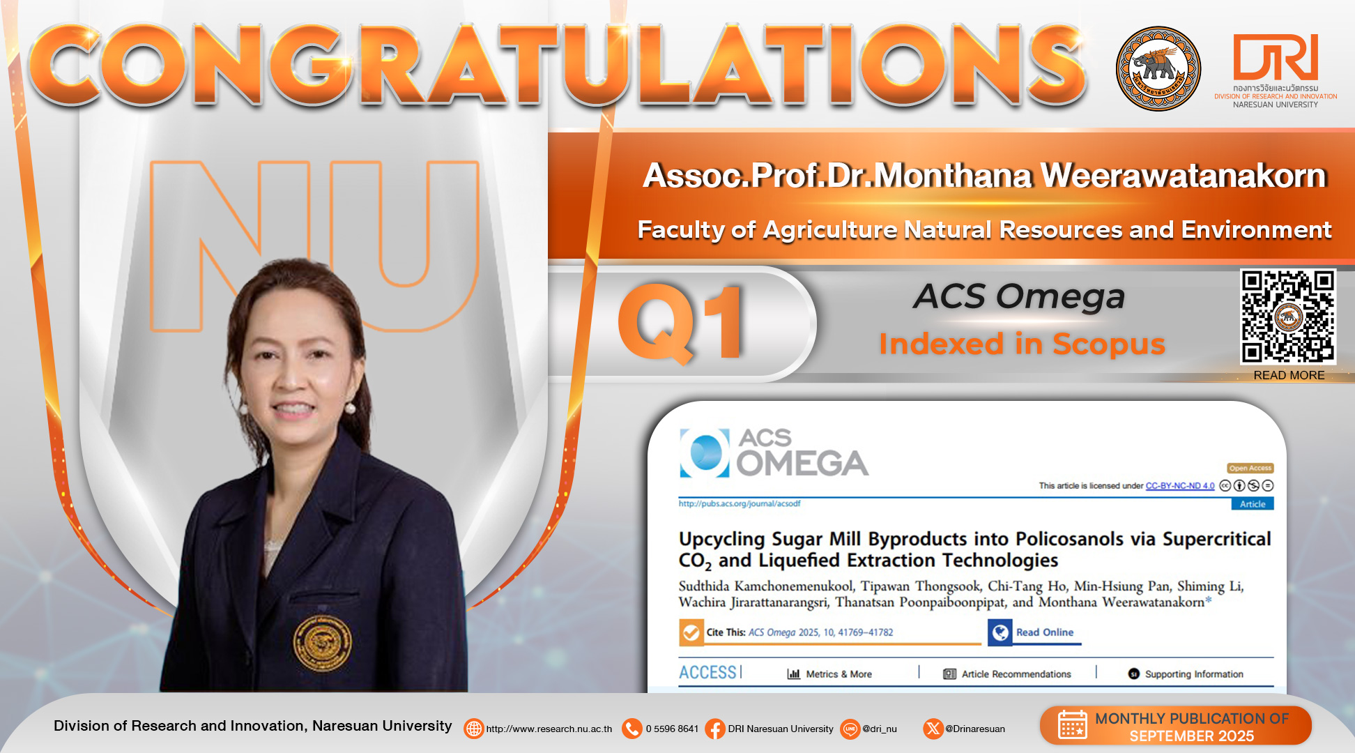 Congratulations to Assoc.Prof.Dr.Monthana Weerawatanakorn Published in International Journal on SCOPUS Congratulations to Assoc.Prof.Dr.Monthana Weerawatanakorn Published in International Journal on SCOPUS link https://doi.org/10.1021/acsomega.5c05754 ______ CR. — Division of Research and Innovation, Naresuan University ข่าวที่เกี่ยวข้อง:การอบรมเชิงปฎิบัติการ แนวทางการพัฒนาเล่มหลักสูตรเพื่อเป็นไปตามมาตรฐานหลักสูตรระดับอุดมศึกษาและสอดคล้...ประมวลภาพ ค่ายเกษตรอาสา ณ โรงเรียนบ้านวังวนราษฎร์พิทยา บ้านวังวน ตำบลสบสาย อำเภอสูงเม่น จังหวัดแพร่Congratulations to Asst.Prof.Dr.Kunlayaphat Wuthijaree Published in International Journal on SCOPUS
