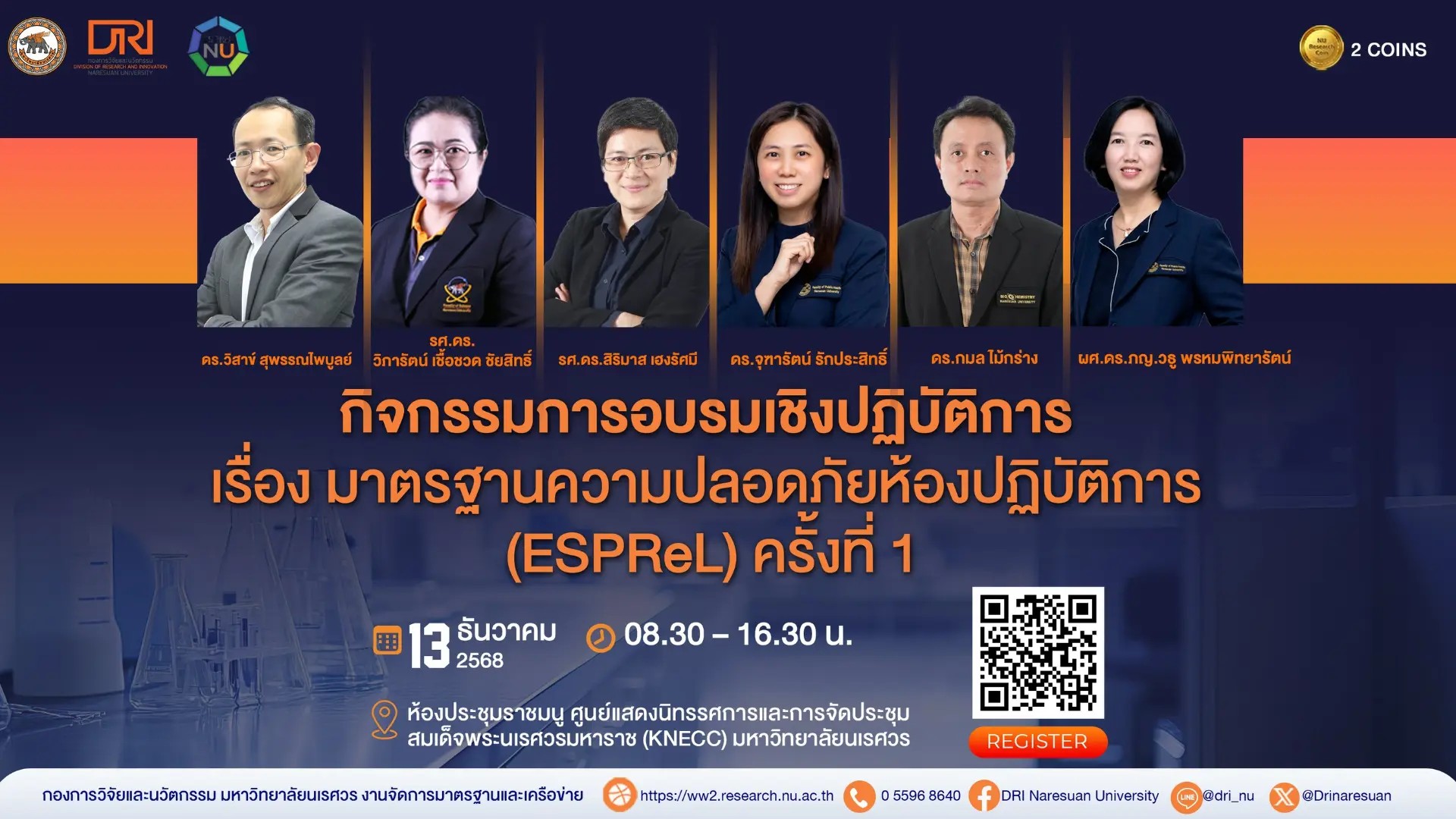 กองการวิจัยและนวัตกรรม มหาวิทยาลัยนเรศวร ขอเชิญนักวิจัย คณาจารย์ บุคลากร และผู้สนใจ เข้าร่วมกิจกรรมอบรมเชิงปฏิบัติการ เรื่อง “มาตรฐานความปลอดภัยห้องปฏิบัติการ (ESPReL)” (7 องค์ประกอบ)