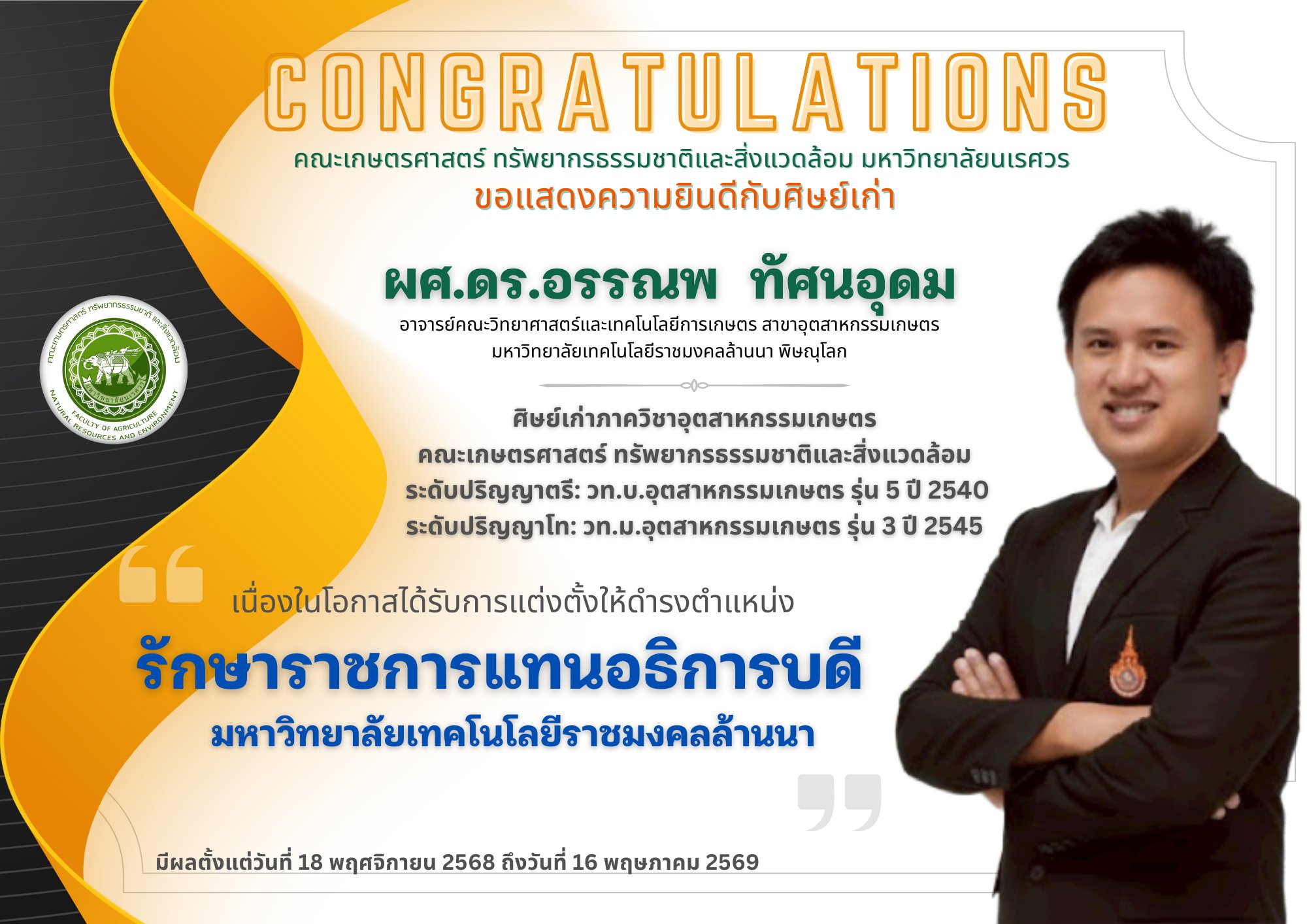 “รักษาราชการแทนอธิการบดี มหาวิทยาลัยเทคโนโลยีราชมงคลล้านนา"