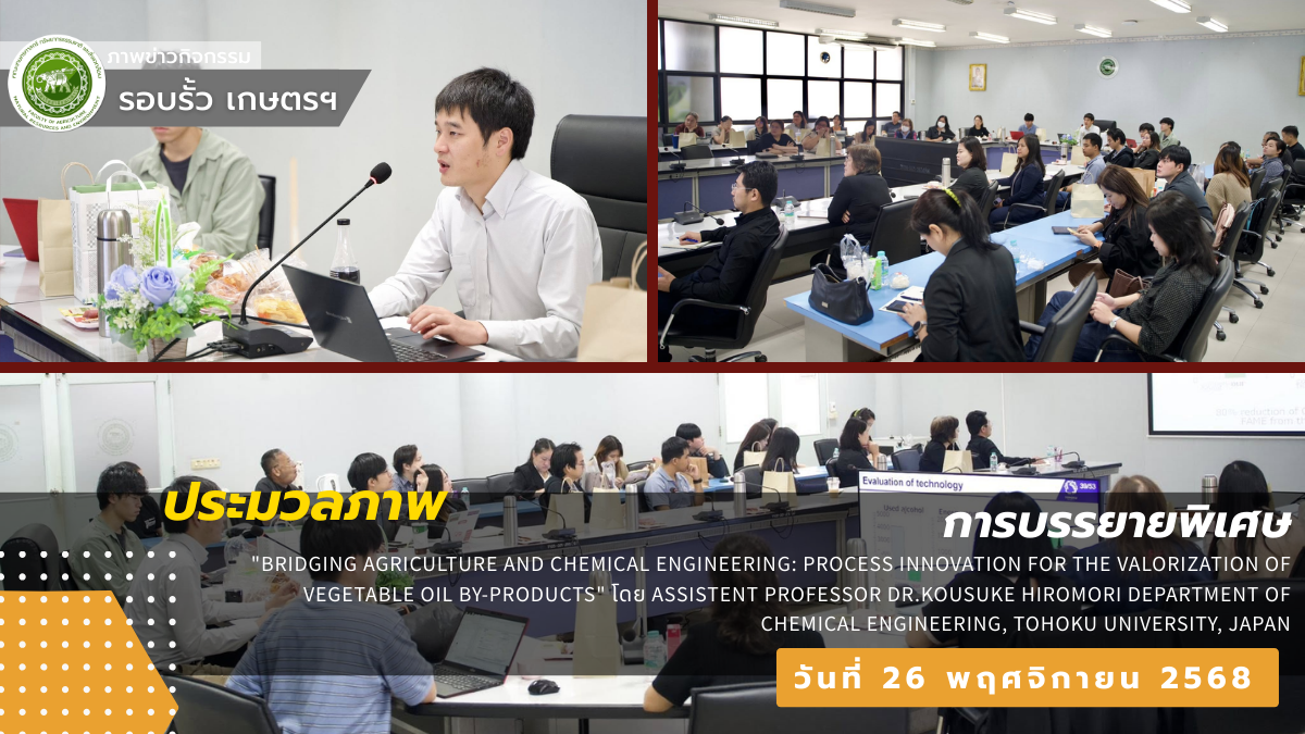 วันที่ 26 พฤศจิกายน 2568 ภาควิชาอุตสาหกรรมเกษตร คณะเกษตรศาสตร์ฯ โดย รองศาสตราจารย์ ดร.เหรียญทอง สิงห์จานุสงค์ จัดกิจกรรมบรรยายพิเศษ “Bridging Agriculture and Chemical Engineering: Process Innovation for the Valorization of Vegetable Oil By-products" โดย Assistent Professor Dr.Kousuke Hiromori Department of chemical Engineering, Tohoku University, Japan ณ ห้องประชุม AG 1104 คณะเกษตรศาสตร์ฯ