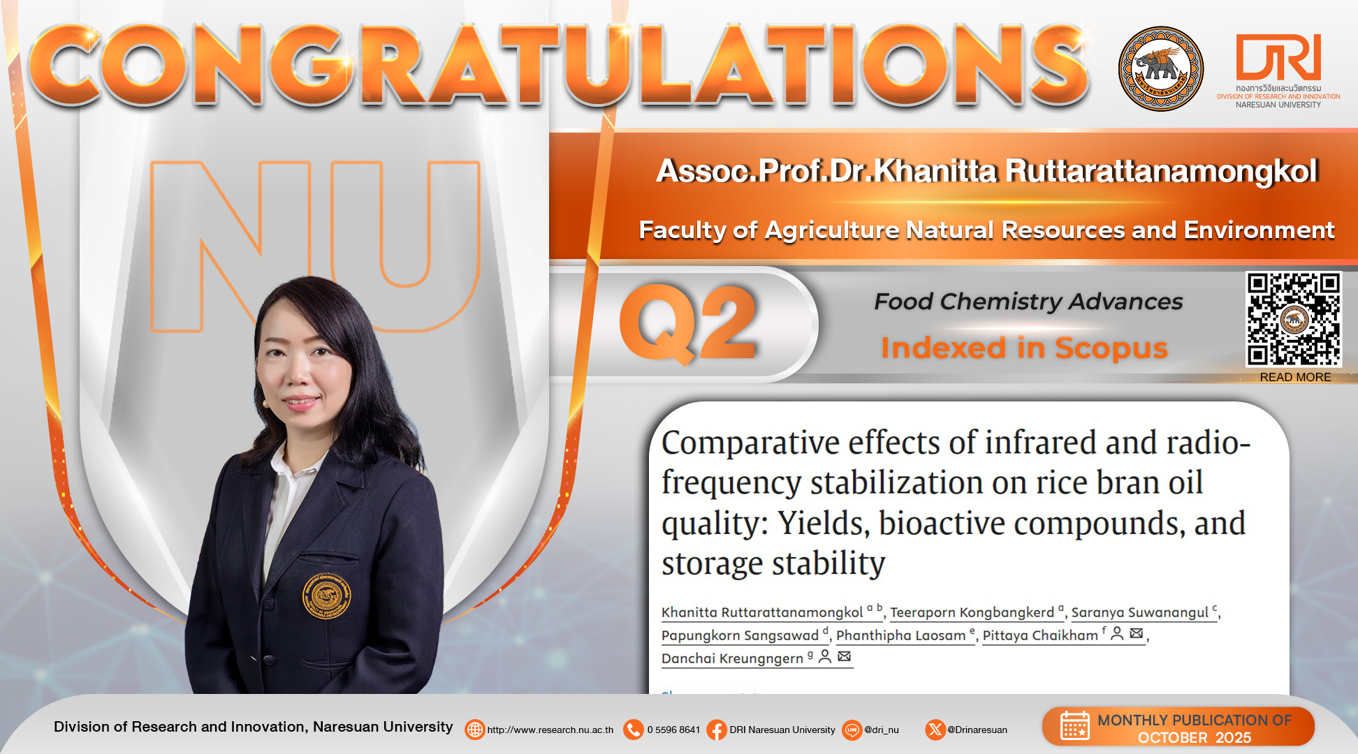 Congratulations to Assoc.Prof.Dr.Khanitta Ruttarattanamongkol Published in International Journal on SCOPUS Congratulations to Assoc.Prof.Dr.Khanitta Ruttarattanamongkol Published in International Journal on SCOPUS link https://doi.org/10.1016/j.focha.2025.101149 ______ ข่าวที่เกี่ยวข้อง:ร่วมพิธีบวงสรวงดวงพระวิญญาณสมเด็จพระนเรศวรมหาราช เนื่องวันสมเด็จพระนเรศวรมหาราช วันยุทธหัตถีและวันกอ...ภาพบรรยากาศการเรียนปฏิบัติการในรายวิชา 108311 Food Processing (การแปรรูปอาหาร) เรื่อง การแปรรูปอาหาร...ต้อนรับคณะผู้แทนจาก College of Engineering, Dong-A University (DAU) มหาวิทยาลัยดงอา สาธารณรัฐเกาหลี