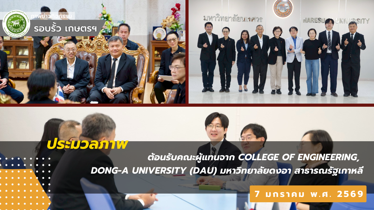 ต้อนรับคณะผู้แทนจาก College of Engineering, Dong-A University (DAU) มหาวิทยาลัยดงอา สาธารณรัฐเกาหลี ข่าวที่เกี่ยวข้อง:ร่วมพิธีบวงสรวงดวงพระวิญญาณสมเด็จพระนเรศวรมหาราช เนื่องวันสมเด็จพระนเรศวรมหาราช วันยุทธหัตถีและวันกอ...ภาพบรรยากาศการเรียนปฏิบัติการในรายวิชา 108311 Food Processing (การแปรรูปอาหาร) เรื่อง การแปรรูปอาหาร...เปิดระบบลงทะเบียนเข้ารับพระราชทานปริญญาบัตรมหาวิทยาลัยนเรศวร ประจำปีการศึกษา 2567 วันที่ 12 ธันวาคม ...
