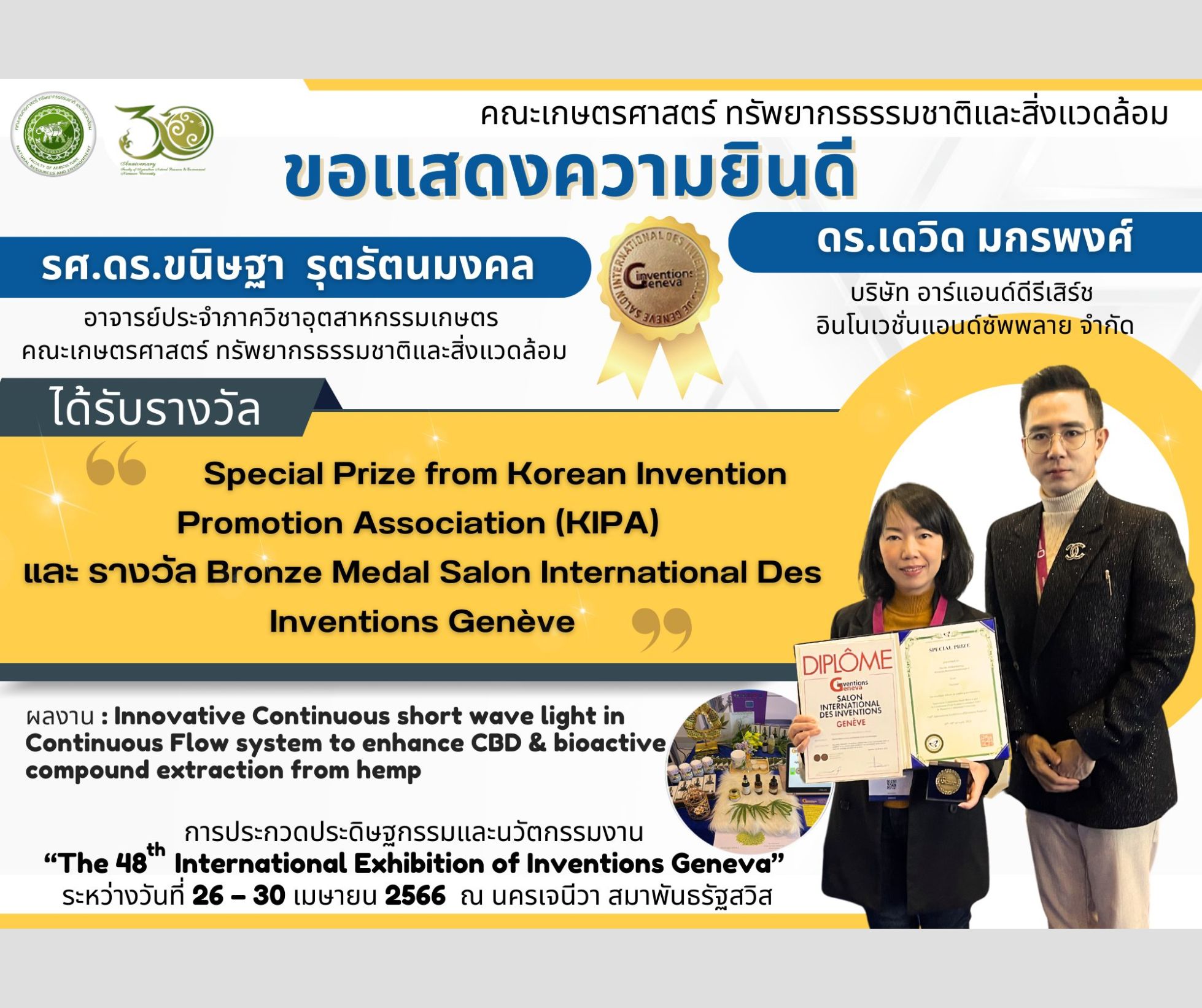 ขอแสดงความยินดีกับ รองศาสตราจารย์ ดร.ขนิษฐา รุตรัตนมงคล อาจารย์ประจำภาควิชาอุตสาหกรรมเกษตร ร่วมกับ ดร.เดวิด มกรพงศ์ บริษัท อาร์แอนด์ดีรีเสิร์ช อินโนเวชั่นแอนด์ซัพพลาย จำกัด