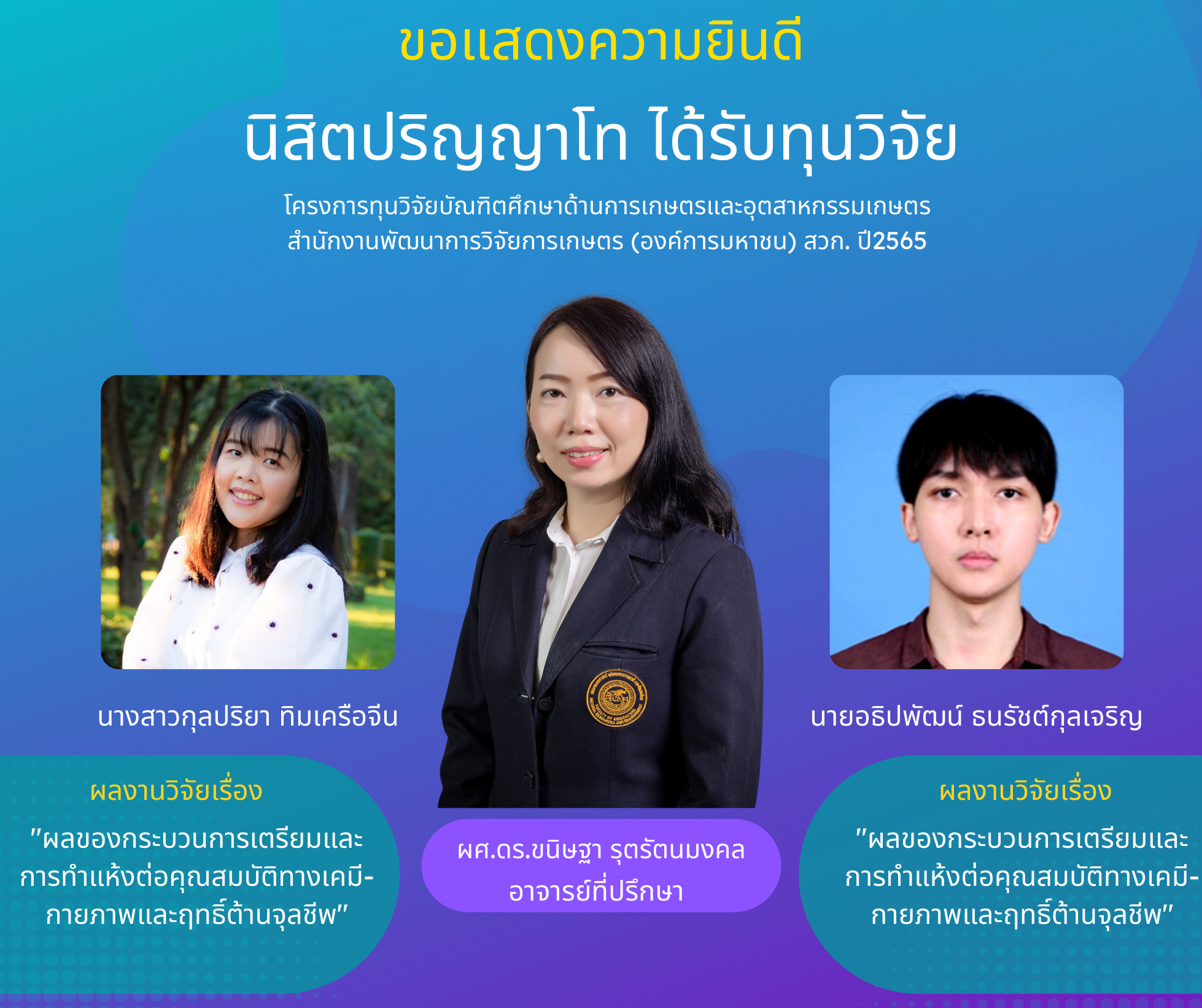 "ได้รับทุนวิจัย" โครงการทุนวิจัยบัณฑิตศึกษาด้านการเกษตรและอุตสาหกรรมเกษตร