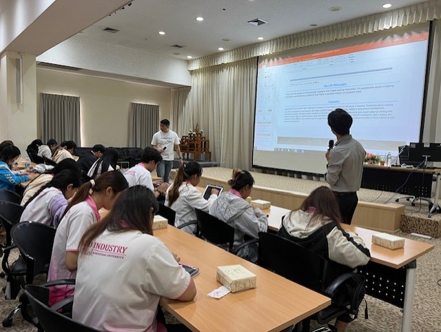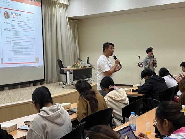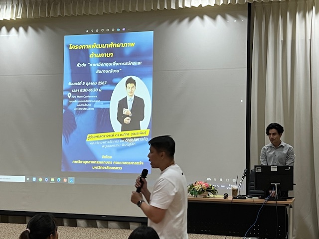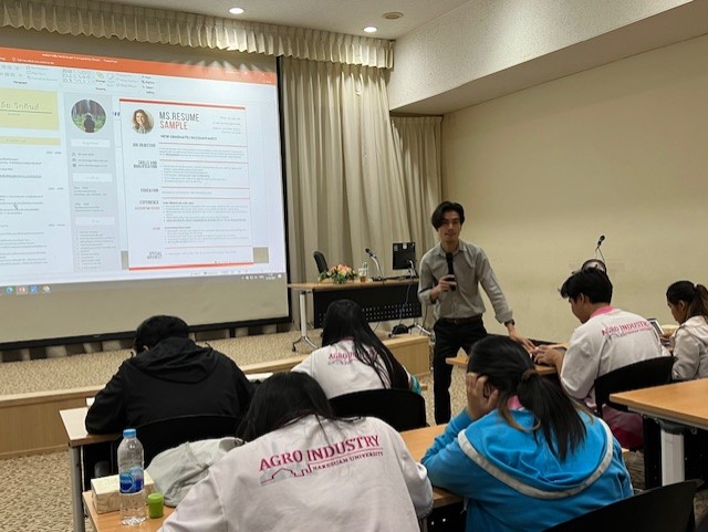 เมื่อวันเสาร์ที่ 5 ตุลาคม 2567 ภาควิชาอุตสาหกรรมเกษตร จัดโครงการพัฒนาศักยภาพนิสิตด้านภาษา หัวข้อ ภาษาอังกฤษเพื่อการสมัครงาน เพื่อเตรียมความพร้อมให้กับนิสิตชั้นปีที่ 4 สาขาวิชาวิทยาศาสตร์และเทคโนโลยีการอาหาร ณ ห้อง Main Conference ณ กองบริการเทคโนโลยีสารสนเทศและการสื่อสาร มหาวิทยาลัยนเรศวร