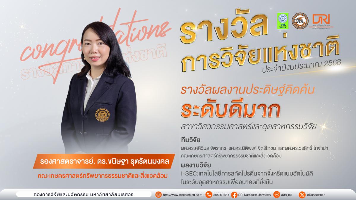 ขอแสดงความยินดีกับนักวิจัย รองศาสตราจารย์ ดร.ขนิษฐา รุตรัตนมงคล และทีมวิจัย ผู้ช่วยศาสตราจารย์ ดร.ศศิวิมล จิตรากร รองศาสตราจารย์ ดร.นิติพงศ์ จิตรีโภชน์ และผู้ช่วยศาสตราจารย์ ดร.วรสิทธิ์ โทจำปา ที่ได้รับรางวัลการวิจัยแห่งชาติ ประจำปีงบประมาณ 2568 จากสำนักงานการวิจัยแห่งชาติ (วช.) รางวัลผลงานประดิษฐ์คิดค้น ระดับดีมาก สาขาวิศวกรรมศาสตร์และอุตสาหกรรมวิจัย ผลงานวิจัยเรื่อง I-SEC : เทคโนโลยีการสกัดโปรตีนจากจิ้งหรีดแบบอัตโนมัติในระดับอุตสาหกรรมเพื่ออนาคตที่ยั่งยืน