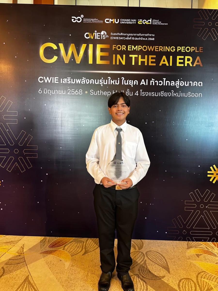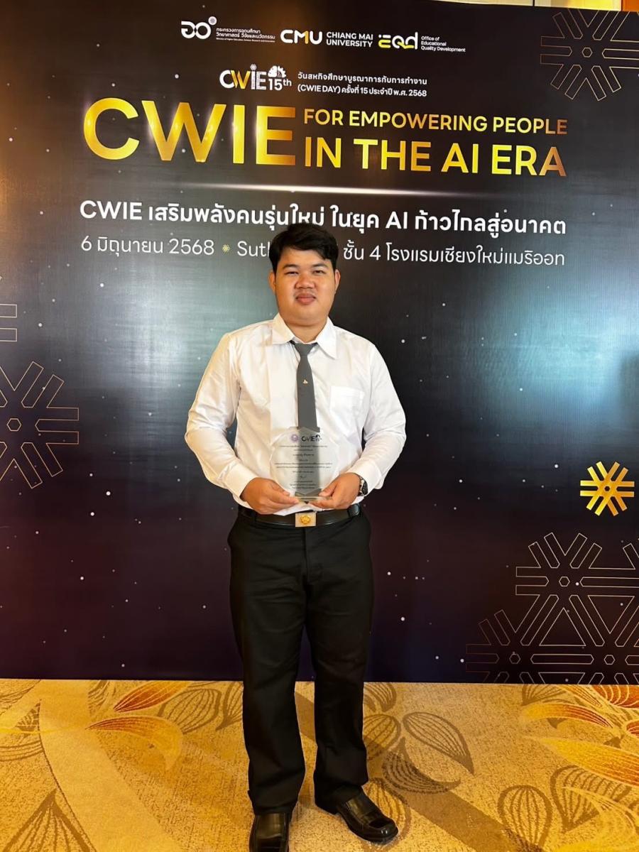 ภาควิชาอุตสาหกรรมเกษตร ขอแสดงความยินดีกับนิสิตปีที่ 4 สาขาวิชาวิทยาศาสตร์และเทคโนโลยีการอาหาร จำนวน 2 คน คือ นายณัชพล สัพทะเสวี และนายศุภณัฐ สิริกุลชวาล เนื่องในโอกาสได้รับรางวัลประเภท นักศึกษาสหกิจศึกษาและการศึกษาเชิงบูรณาการกับการทำงานที่มีโครงงาน/ผลการปฏิบัติงาน “รางวัลรองอันดับที่ 1” กลุ่มสาขาวิชาวิทยาศาสตร์และเทคโนโลยีดีเด่น เครือข่าย CWIE ภาคเหนือตอนล่าง จากโครงงานเรื่อง การลดระยะเวลาในการทำความสะอาดเครื่องจักรไลน์ Extrude 2 สถานประกอบการ บริษัท ยูนิลิเวอร์ไทย โฮลดิ้งส์ จำกัด ซึ่งเป็นผลจากการที่นิสิตไปฝึกสหกิจศึกษา ในภาคเรียนที่ 2 ปีการศึกษา 2567 โดยนิสิตได้เข้ารับรางวัลดังกล่าวในงาน CWIE DAY ครั้งที่ 15 ประจำปี พ.ศ.2568 ในวันที่ 6 มิถุนายน 2568 ณ Suthep Hall ชั้น 4 โรงแรมเชียงใหม่แมริออท จังหวัดเชียงใหม่