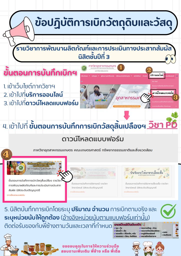 1. นิสิตบันทึกการเบิกวัสดุสิ้นเปลืองลงใน Google form เพื่อเก็บข้อมูลการใช้วัสดุสิ้นเปลืองของนิสิต ในรายวิชาการพัฒนาผลิตภัณฑ์และการประเมินทางประสาทสัมผัส (108351-2 Product Development and Sensory Evaluation)